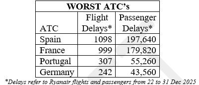 Ryanair, Europe’s No.1 airline, today (Thurs, 8 Jan) published the table of “ATC GRINCHES” that ruined Christmas travel for over 600,000 Ryanair passengers during the festive season. This comes after over 3,200 Ryanair flights and 600,000 Ryanair passengers suffered avoidable ATC delays over the Christmas travel period (22-31 Dec) due to ATC staff shortages. Spain and France were by far the worst performing ATC providers this Christmas, accounting for 34% and 31% of delays respectively.