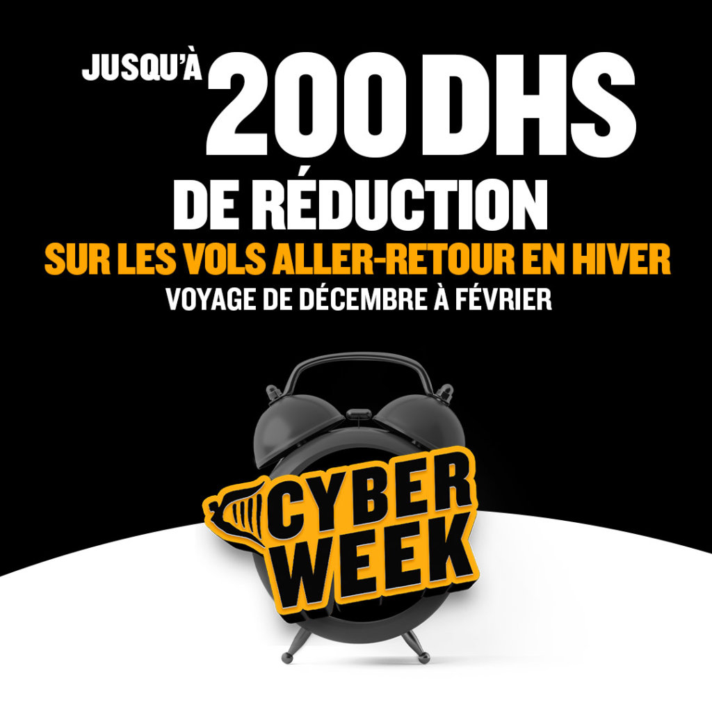“C’est le quatrième jour de notre incroyable offre pour la “Cyber Week” et nous proposons jusqu’à 200 DHS de réduction sur les vols aller-retour pour voyager en décembre et en janvier, uniquement disponible à la réservation jusqu’à minuit ce soir (23h59 mercredi).