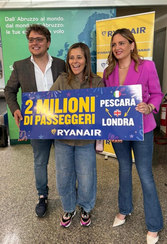 “Ryanair è lieta di festeggiare i primi 2 milioni di passeggeri sulla rotta Pescara – Londra Stansted. Questo significativo traguardo testimonia la crescita continua di Ryanair e gli investimenti della compagnia sull’Aeroporto d’Abruzzo. Questa estate, Ryanair opera attraverso una programmazione robusta da/per l’Aeroporto d’Abruzzo, con oltre 160 voli settimanali su 10 rotte, incluse le nuove da/per Breslavia, Cagliari, Milano Malpensa, Kaunas e Valencia. Questa programmazione è sostenuta dall’impegno di Ryanair nei confronti dell’Aeroporto d’Abruzzo, con un aeromobile basato in più, per un totale di 200 milioni di dollari di investimento, e il supporto ad oltre 950 posti di lavoro. Ryanair è inoltre lieta di offrire al 2 milionesimo passeggero sulla rotta Pescara – Londra Stansted, Maria Prato, residente a Londra, reduce insieme al marito da un weekend di vacanza in Abruzzo, una gift card del valore di 50€ per viaggiare de/per qualunque destinazione del network Ryanair, invitandola a sedersi, rilassarsi e a godersi il viaggio. Non vediamo l’ora di trasportare sempre più passeggeri sui voli a tariffe basse di Ryanair da/per l’Aeroporto d’Abruzzo nei prossimi anni”.