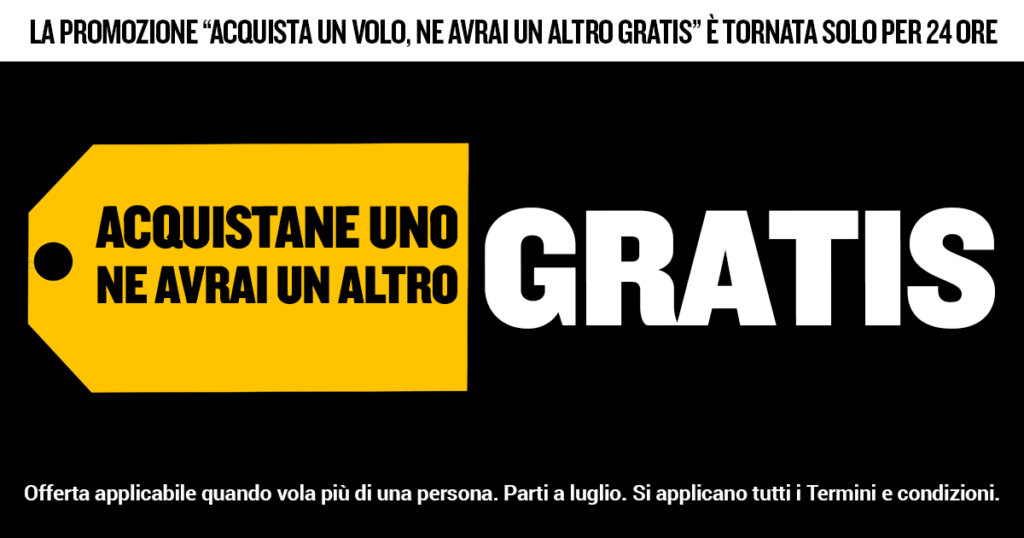 I clienti possono prenotare una meritata vacanza o un city break nelle migliori destinazioni europee, portando gratuitamente un amico o un familiare. Per usufruire di questa offerta speciale, suggeriamo ai clienti di agire in fretta e visitare il sito Web Ryanair.com per prenotare i loro voli entro la mezzanotte di stasera, 7 luglio”.