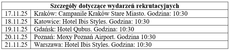 „Z radością ogłaszamy wielką akcję rekrutacyjną w Polsce, w ramach której oferujemy 300 nowych stanowisk dla personelu pokładowego w Buzz Air w Polsce. Dzięki temu będziemy mogli realizować nasze intensywne działania w sezonie letnim 2026 r., kontynuując inwestycje i rozwój w całej Polsce. Zapraszamy osoby zainteresowane dołączeniem do Ryanair – największej i najtańszej linii lotniczej w Europie – oraz zdobyciem atrakcyjnej pracy jako członek personelu pokładowego, gdzie zaangażowanie jest odpowiednio wynagradzane szybkim awansem, zniżkami na podróże i innymi korzyściami. Zapraszamy do udziału w spotkaniach rekrutacyjnych, które odbędą się od poniedziałku 17 listopada do piątku 21 listopada. Będzie to okazja do spotkania się z zespołem rekrutacyjnym i zespołem personelu pokładowego oraz uzyskania dodatkowych informacji na temat pracy. Aby uzyskać więcej informacji i szczegółów dotyczących wydarzenia, zachęcamy do rejestracji na stronie careers.ryanair.com.”