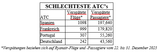 Ryanair, Europas Fluggesellschaft Nr. 1, hat heute (Donnerstag, 8. Januar) die „ATC GRINCHES” veröffentlicht, die über 600.000 Ryanair-Passagieren während der Feiertage die Weihnachtsreise vermiest haben. Dies geschah, nachdem über 3.200 Ryanair-Flüge und 600.000 Ryanair-Passagiere während der Weihnachtszeit (22.-31. Dezember) aufgrund von Personalmangel bei Flugsicherungen vermeidbare Verspätungen hinnehmen mussten. Spanien und Frankreich waren mit Abstand die schlechtesten Flugsicherungen dieses Weihnachten und waren für 34 % bzw. 31 % der Verspätungen verantwortlich.