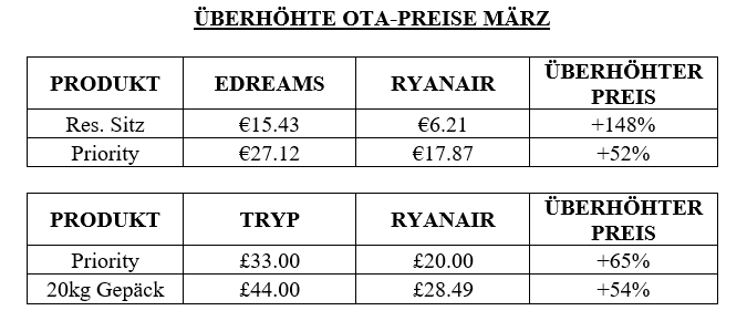 RYANAIR OTA-ERHEBUNG IM MÄRZ ZEIGT: EDREAMS & TRYP VERLANGEN DOPPELT SO HOHE PREISE ALS RYANAIR